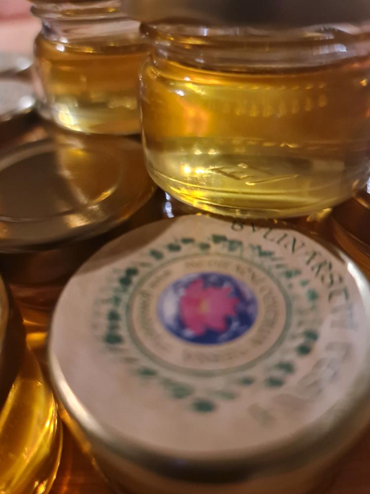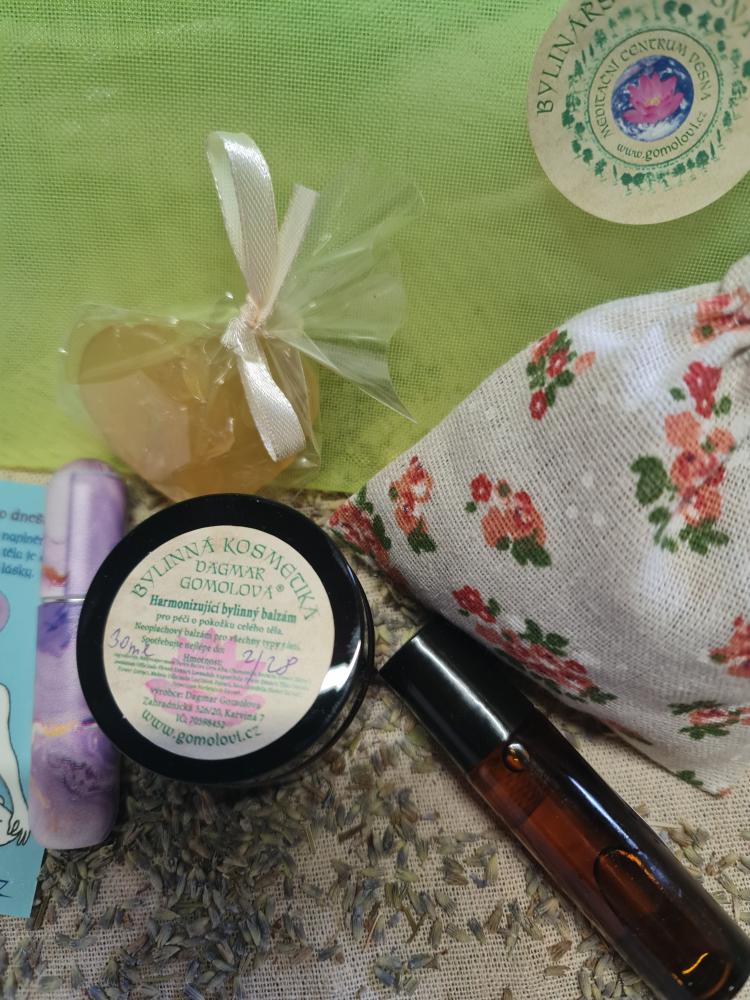 BYLINKOVÁ LEKARNIČKA v síťovaném pouzdře obsahující jasmínový olej pro ošetření kůže včetně rtů, Růžový parfém pro očistu aury a prostoru. Bylinkovou voničku pro přípravu čaje. Harmonizující bylinný balzám pro péči o pokožku a centra čaker v balení 30ml. Medové andělské mýdélko pro dezinfekci rukou.